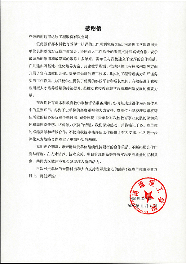 集團近日收到南通理工學(xué)院的感謝信,對其在本科教育教學(xué)審核評估中的大力支持表示誠摯感謝。
