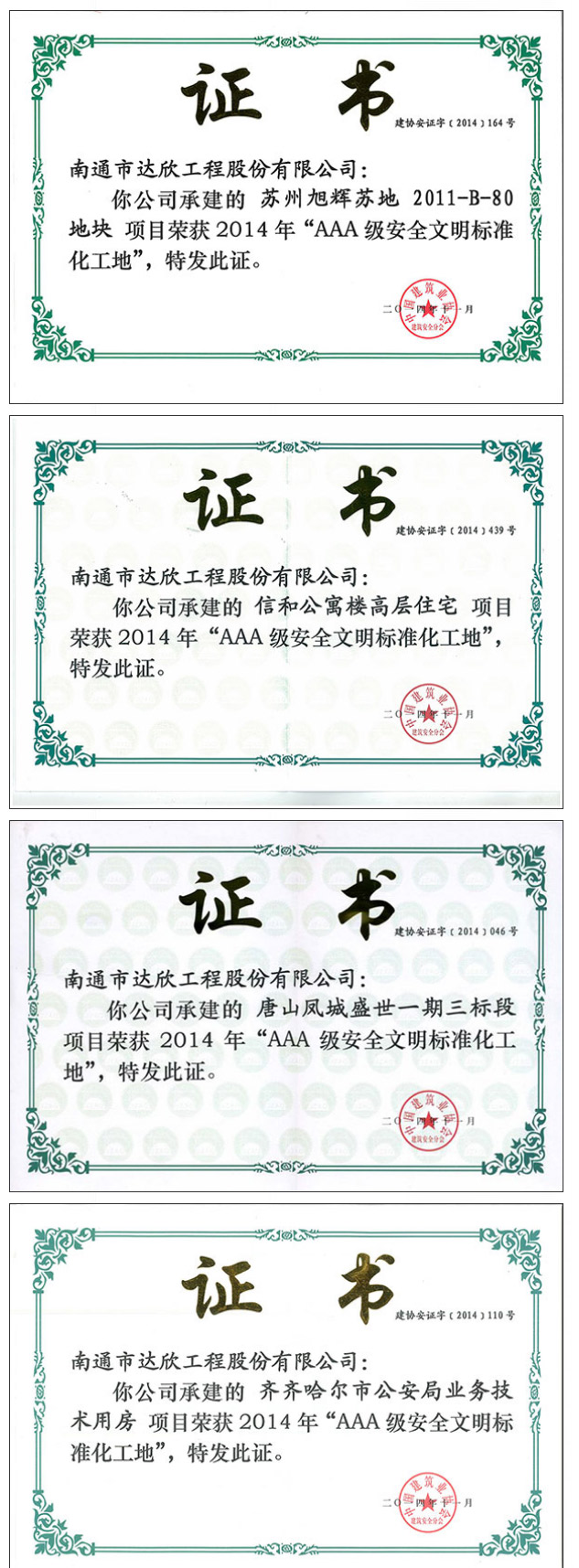 近幾年我公司獲得全國AAA級安全文明標準化工地16項,創(chuàng )建面涉及上海、江蘇、湖南、河北、黑龍江、新疆等市場(chǎng),安全文明施工管理水平再上新臺階,榮譽(yù)的取得為進(jìn)一步提升達欣品牌在全國各個(gè)市場(chǎng)的影響力,為進(jìn)一步提升企業(yè)形象、促進(jìn)企業(yè)長(cháng)遠發(fā)展奠定堅實(shí)的品牌基礎。