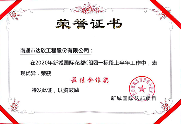 近日,新城國際花都C組團一、二標段項目,在公司各級領(lǐng)導的關(guān)心支持下,在項目全體施工人員的共同努力下,提前實(shí)現交付。為此,獲得長(cháng)沙新城萬(wàn)博置業(yè)有限公司工程授予的《奮勇拼搏》、《最佳合作》兩個(gè)獎項,博得了新城萬(wàn)博置業(yè)有限公司對我司工作的高度認可。