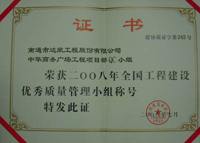 2008年7月6日,由中國建筑業(yè)協(xié)會(huì )組織的2008年度全國工程建設優(yōu)秀質(zhì)量管理(QC)小組活動(dòng)成果發(fā)布會(huì )在廣西桂林落下帷幕,我公司中華商務(wù)廣場(chǎng)工程項目部QC小組作為河北省推薦的十二個(gè)省級QC小組之一參加了會(huì )議并榮獲全國工程建設優(yōu)秀QC小組。這是我公司以“達欣”品牌獲得的第一項國家級 QC成果獎。
